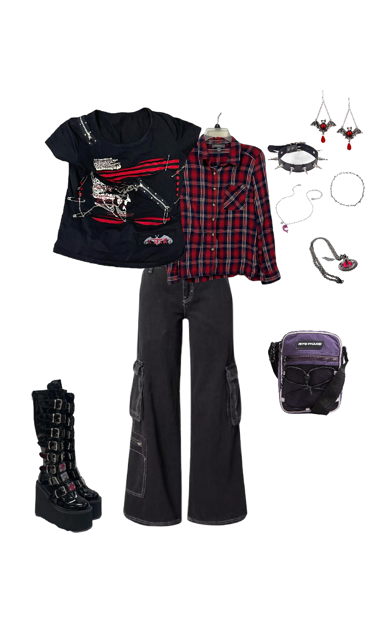 Outfit for my first ever concert! Not pictured are the peacock feathers I braided into my hair. I think I did pretty well considering I had no reference for what I would need and the weather being So Hot. The Demonias may or may not have been overkill considering we had seated... well seats, but being tall (read: barely grazing average height) is part of the look. Because it was mid summer and boiling, I did keep the flannel tied around my waist. Why didn't I just leave it at home? Because it's my summer alternative to the leather jacket, AKA a comfort blanket. The jeans came in super handy because I could stuff so much into the pockets and the tiny bag limit didn't feel stifling. Actually, these jeans and my Demonias have become concert staples somewhat, though I do need to mend the jeans which I have been putting off for months. Edgy accessories aside, I wore my Claire's pink dolphin necklace, which is actually half of a set I got with my best friend :3 I went to the concert with her so it only seemed natural to bring it along with me. His name is Final Fantasy VII. My bag, another thing that has become a concert staple, did clash with the rest of my outfit, but matched my signature purple eye makeup, so it's not too awful a fashion faux-pas lol. It's a tiny little thing I impulsively bought for £5 at an Urban Outfitters sample sale at my campus (I asked if they had it in black or red, they said no) and I was a little worried I wouldn't get much use out of it because of the colour, but it has proved perfect for concerts. I think it's a crossbody, but I prefer to tighten it around my hips like a waist bag. It fits so much in it, plus with my pockets, I could have carried all my belongings if I wanted. The Demonias are awful, by the way. I have not once worn them without wanting to burn them by the end of the night. I never learn my lesson and will continue to abuse my feet with these torture devices every time I see a show.