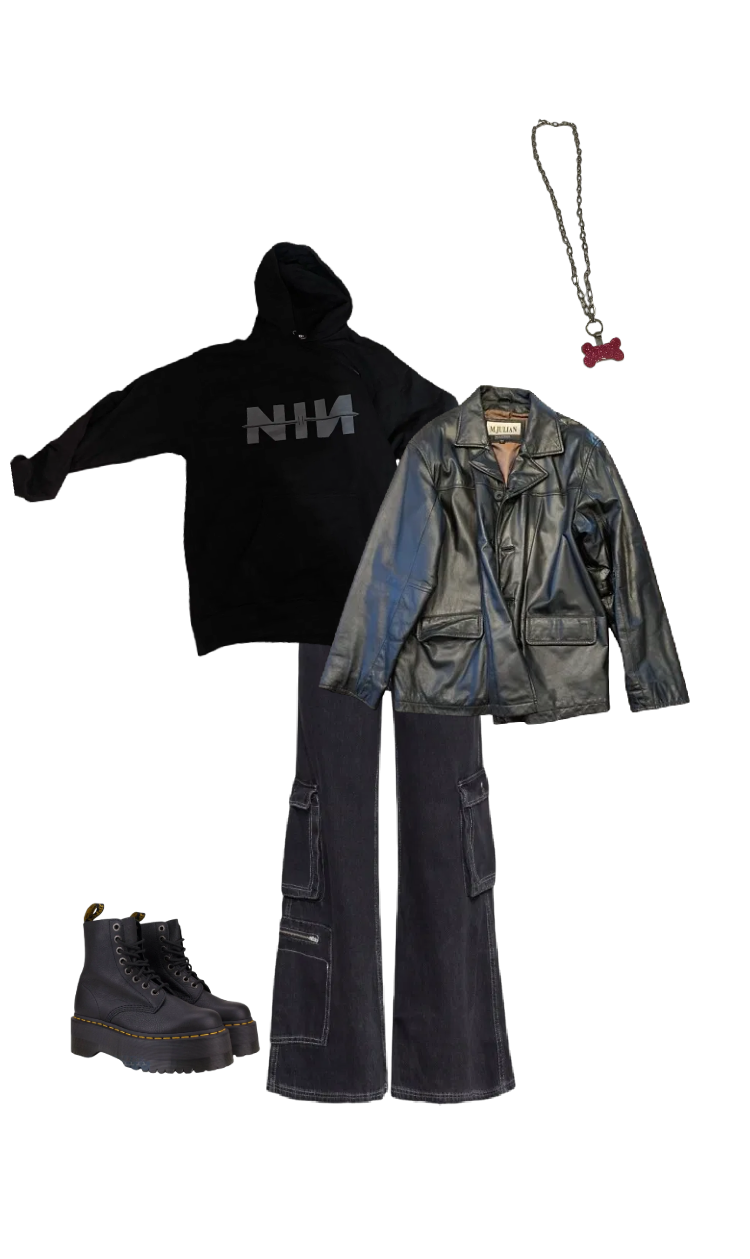 Another one that I'm not wearing today, but is so commonly in my rotation that I need to document it. I'm realising as I make this post that having an all-black background for this page when that's the only colour of clothing I wear is unwise... Hmmm, maybe open the image into a new tab for a clearer view? I call this my boy outfit because it makes me look like a boy. I wear it when I'm too lazy to get dressed and want to feel invisible, but if anything it probably just makes me look very suspicious with my mask and hood. I thrifted this hoodie and it was long enough to be a dress until I washed it and it shrank in a way that made the hood sit really oddly. I ripped the neck to try fixing it, and the hood sits better now, but now the hoodie has a V neck I can't tell if I like or not. The back of the hoodie has this yellow graphic of a man's face, but I have no idea where it's from. I do also wear this outfit without the jacket if it's too warm, but normally I love layering. I got the dog tag at Timpsons and had it custom engraved, and stuck it onto an old chain I never wear. What's engraved on it? It's a secret :3
