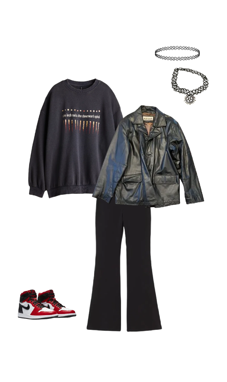 I'm not wearing this today (or at least not the shoes, jacket, and chokers), but such a frequent flyer surely deserves a mention. This has been my "having to go run errands with no prior warning" outfit, AKA throwing on my leather jacket and shoes over what I'm already wearing 99.9% of the time. I have worn this sweatshirt to Death. It is not an exaggeration to say I've worn these sweatshirt and leggings almost every day of the year so far. The leather jacket is a little too big on me, but I'm afraid I'll ruin it so I haven't tried to shrink it just yet. Fun fact, this is the exact same jacket early seasons Dean Winchester wears, except in black. I've usually only been wearing one choker, but I tried layering two recently and really liked the way it looked. I "made" the one with the charm, if you can count opening and closing a jumpring from a broken necklace around a piece of plastic "making". Obviously, this is a very basic outfit, glorified loungewear, really, but it makes me feel enough like myself that I wouldn't be tooooooo embarassed running into someone.